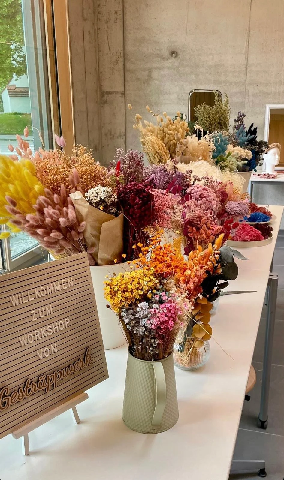 Am bunten Blumenbuffet findest du eine liebevoll zusammengestellte Auswahl hochwertiger Trockenblumen, aus der du ganz nach Lust und Laune wählen kannst.